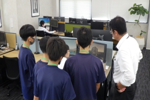 1日目は現場モニター確認、ラウンジにて卒業生の大先輩との歓談などの社内見学と、将来住んでみたい家の間取りを考え3D処理プログラムにて外壁や植栽などをデザインする設計業務体験、また測量業務体験としては3Dスキャナーで生徒さん自身を取込み点群データにするなど、ゲーム感覚で楽しく体験してもらいました。