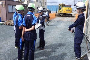 2日目は工事中の現場を廻り、杭打ち・土工事・鉄骨建て方・内装工事などいろいろな工事を見学してもらい、各現場の監督より丁寧で分かりやすい説明を受けました。中でも約30mの杭打機が実際に稼働している現場は迫力満点だったと思います。